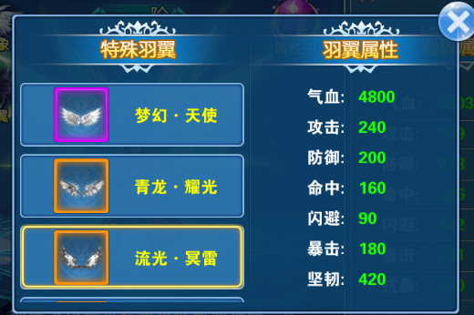 2.特殊羽翼:在特殊羽翼界面可以查看特殊羽翼的战力属性。