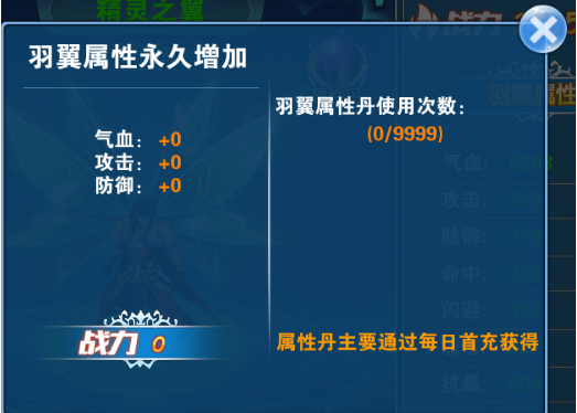 3.属性丹:羽翼属性丹可以通过每日首充和运营活动得到,使用后可增加羽翼系统的属性。在属性丹界面可以查看自己使用了多少羽翼属性丹,已经这些羽翼属性丹增加的总战力。