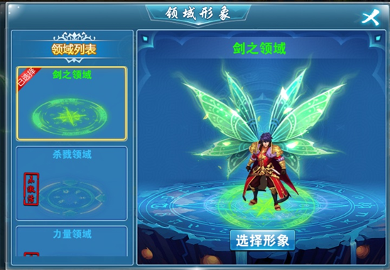 三、领域:羽翼的领域总计有十阶,每阶都有不同的领域形象,具体表现为脚下的光阵。使用跨界石可以提升领域的阶数。跨界石可以在商城购买,运营活动也有投放。界面右侧是羽翼领域系统的战力属性。点击选择领域,可以打开选择领域形象的面板。