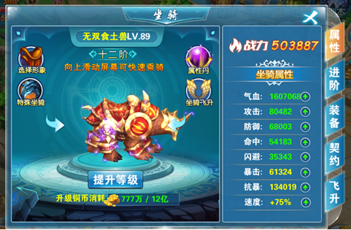 三、坐骑进阶:消耗坐骑之魂来提升坐骑的阶级,解锁更多坐骑形象,坐骑之魂可通过商城获取