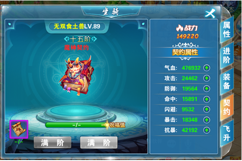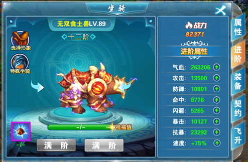 一、坐骑系统分为五个模块,属性、进阶、装备、契约、飞升