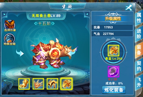 四、坐骑装备:可通过消耗特定部位的炼化石来提升坐骑装备的等级,炼化石可通过商城或者守卫神城来获取