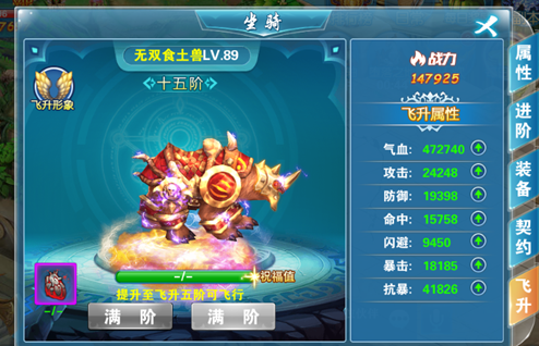 六、坐骑飞升:消耗幻兽之心来提升飞升的阶级,解锁更多飞升形象,幻兽之心可通过商城获取