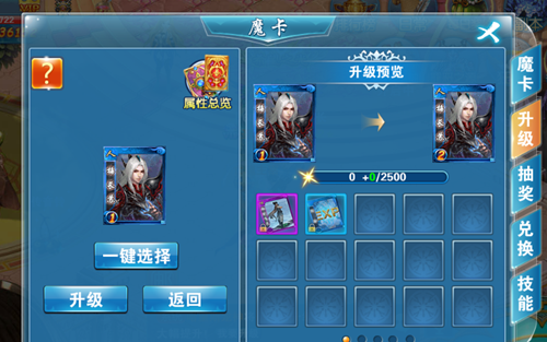 三、升级:选择一个魔卡后,可以对它进行升级,升级的材料为其他魔卡,或者经验魔卡。魔卡级别越高,战力属性越高。一套魔卡都达到一定级别后会获得额外的战力和技能。