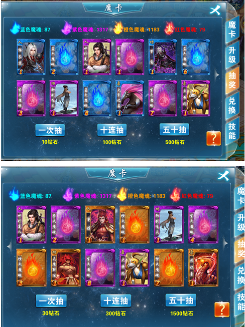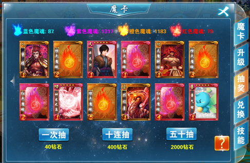 四、抽奖:有三种品质的抽奖,每种品质可抽到两种品质的形象魔卡和魔魂。抽到的魔卡会自动放在魔卡仓库中。最低品质的抽奖每天有一次免费次数,不使用不会叠加。魔魂可以用于魔卡兑换。