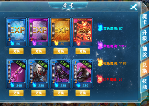 五、兑换:玩家可以在兑换界面使用自己在魔卡抽奖获得的魔魂来兑换相应品质的形象魔卡。也可用魔魂来兑换经验魔卡,用于已激活形象魔卡的升级。