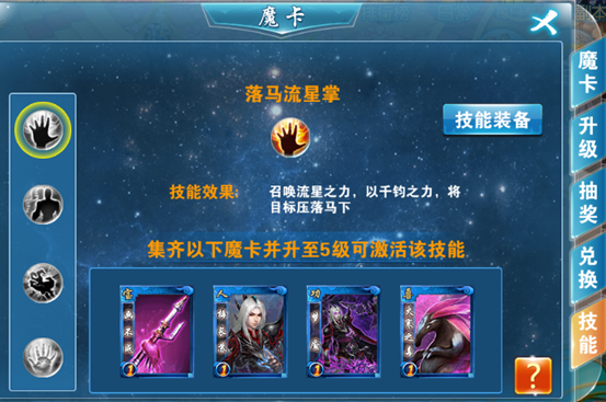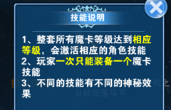 六、技能:每套魔卡都有一个独特的技能,且同一时间只能装备一个技能。当一套魔卡集齐,且该套魔卡的等级都达到一定数值,这套魔卡对应的技能会激活。魔卡技能主要用于玩家间的PK对战。