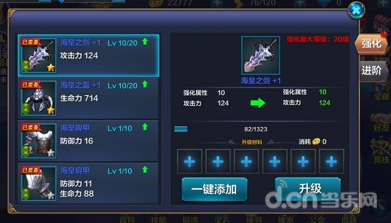 强化:打开系统的界面,我们首先能对装备进行强化,装备当前的强化等级以及最高能强化到的等级都有展示出来,强化所需的升级材料则是其他品质的装备,点击一件添加之后能选择我们要将什么品质的装备作为狗粮,小编当然选择的是绿色的装备啦!