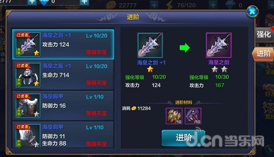 进阶:另外一个功能是进阶功能,进阶能将装备的品质提升一个等级,基础属性有明显的增长,同样强化等级也会跟着提升。