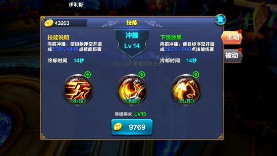 三个技能的冷却时间分别是10、19、14秒,在战斗时采用冲撞+旋风斩+碎山击+3普攻+冲撞+碎山击+旋风斩的技能释放顺序可以打出非常漂亮的连击,即使是在敌人的人群中也可以轻松披荆斩棘、冲锋陷阵。