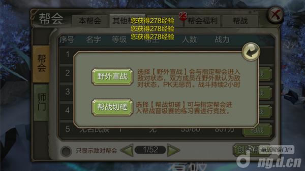 一个帮会可以有一个帮主以及若干的副帮主,副帮主可以收人或者踢人,还能像其他帮会进行越战。现在开放的约战有野外宣战和帮战切磋,野外宣战会与指定帮会进入敌对状态,对方成员在野外默认为敌对状态,PK无惩罚。战斗持续2小时。帮战切磋可与指定帮会进入帮战晋级赛的练习赛进行竞技。