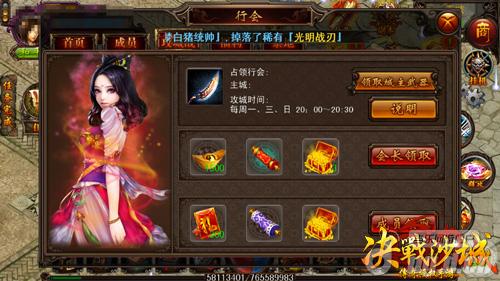 要说《决战沙城》最让人兴奋、人气最旺的地方就是沙城,每周一、三、日晚定时开展的沙城争霸战,真正行会之间的实力较量。身为会长的我带头群战义不容辞,当然拿下大旗不容易,全靠兄弟们一起努力,大家浴血奋战拼力厮杀掩护我占领旗帜。记得其中有一次,几个行会一起攻城,我已经占领了沙城中象征胜利的旗帜,但是在最后关键的几分钟,杀进来一波实力相当的敌人,沙城差点失守,公会兄弟们号召了更多的人上线参战,最后才得以守住。平时公会内的兄弟们非常“基情”哟,当然希望我们的公会能长久一起战斗,浴血奋战同甘共苦!