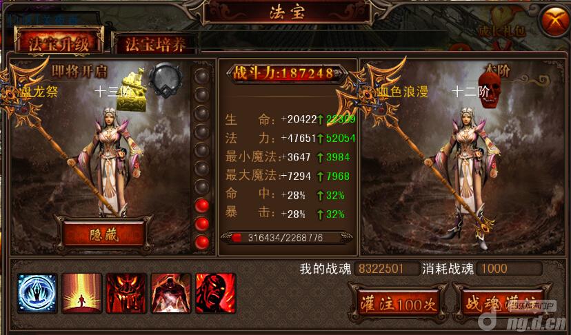 法宝需要消耗战魂进行升级,战魂可以通过任务或商城购买战魂丹来获得,法宝升级后不仅从外观还有属性加成方面都有了大幅度的提升。
