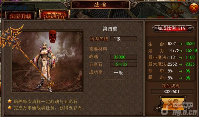 在法宝系统中还能够对当前法宝进行培养,法宝培养需要消耗五彩石(可通过商城或任务中获得)和战魂,培养成功后可以增加当前法宝的属性比例,法宝等级越高加成越多。