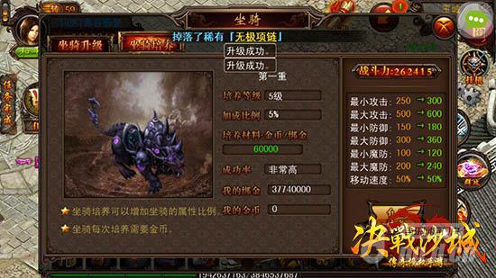 在《决战沙城》中坐骑不仅仅只是代步工具提升移动速度,也是勇士们快速成长的强大助力之一。在花费一定金币令坐骑等级提升的同时,角色也会获得相应属性加成,同时再利用金币加以培养,每培养上升一级,便能加成角色的攻击、防御、魔防和速度值。如此勇士们便可一路扶摇直上,唤醒逆天属性,战无不胜!更重要的是坐骑最终还能进阶为天下地上唯吾独尊的超阶神兽,伴你闯荡天下!
