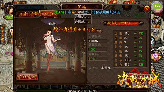 星魂系统是《决战沙城》中的一个特色玩法,玩家在等级45级后可以开启。星魂培养将在145级开启,可增加攻击值、防御值、魔防值、命中、闪避、暴击、生命上限及法力上限等属性。除此之外,最重要的是每培养进阶一重星魂,还会有巨大的战力加成。星魂激活后可以提高勇士各方面的属性值,星魂等级越高所获得的属性越惊人的,分分钟超越小伙伴,新一代战神就是你!