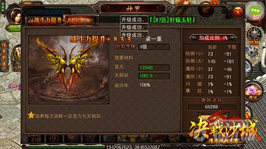 神甲是《决战沙城》中最华丽的装备,伴随着神甲等级的提升,外观将愈发华丽,同时逆天的专属技能槽也会逐渐开启。神甲系统的进阶需要以灵力作为支持,而其培养则需要灵力以及天羽翎同时具备。每培养一次神甲,将同时提升防御的最大和最小值、魔防的最大和最小值以及闪避、暴抗值,并且还将直接提升角色战力值。凭借灵力和天羽翎,悉心培育出堪称极品的逆天神甲,百分百飙升任务战力加成属性,高贵冷艳范不在话下,还能享受畅快无比的终极对决!