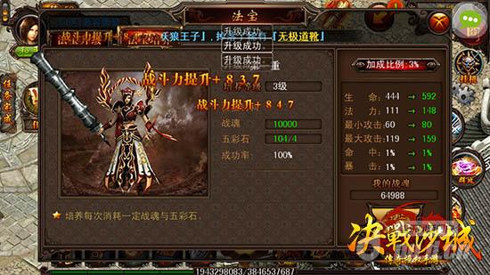 《决战沙城》闪耀法宝会随着等级的进阶而变换形态,漂浮于游戏人物的左上方,等级越高所附加于人物的属性就越强大,提升的战力也就越高,当然外观也会愈加绚丽夺目。同时法宝还有特殊的法宝技能,是增强战力的又一大绝好利器。要想培养法宝系统,必须同时具备足够的五彩石和战魂,每培养提升一级法宝,将会加成生命、法力、最小和最大攻击、命中以及暴击。把握好最佳时机,进阶法宝,出其不意克敌制胜,你就是那个最闪耀的沙城霸主!