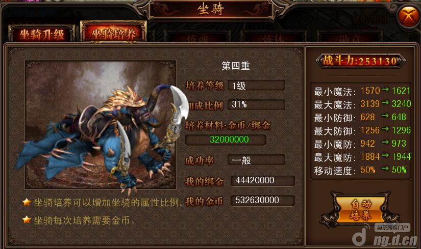在坐骑系统中还能够对当前坐骑进行培养,坐骑培养需要消耗金币,培养成功后可以增加当前坐骑的属性比例,坐骑等级越高加成越多。