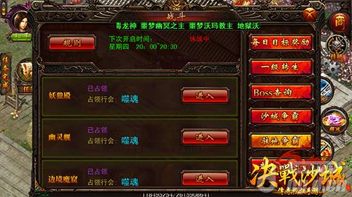《决战沙城》战斗界面中有沙城争霸与驻地争霸两大副本,这两大系统均为游戏内最核心的以行会为单位的群战副本。每周一、三、日的20:00-20:30是《决战沙城》沙城争霸战开启的时间,只要进入沙城,血战一触即发!象征王权的旗帜就屹立于沙城之中,只要占领成功便可成为天下第一行会,名动四方!不过这个占领行为只有会长或者副会长可以完成,其余会员只能无所不用其极,替行会达成占领目标。