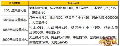 返利礼包(消耗1960元宝):星魂*2w、灵力*3w,战魂*3w、保护勋章*1、月光宝盒*3、绑定金币*300000