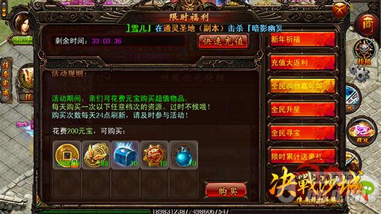 【活动内容】手快有手慢无,新年抢购第二波来袭!活动持续时间内,玩家可在限购活动内购买限量礼包,超值限量史上难得一见,别犹豫赶紧下手!限购次数会在每日的24点重置,奖励内容如下。