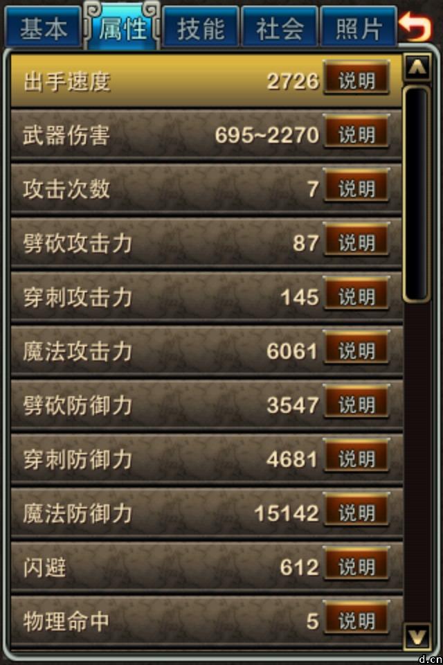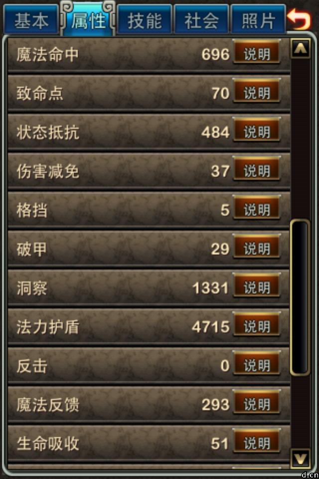 四、属性: 血3860 蓝14474 出手2726 武伤695-2270 攻次7 魔攻6000 魔防1万5 魔命696 闪612 致命70 抗484 洞察1331 盾4700 血吸51 法吸434 回蓝1875 83%挡 打石: 3件致命 3件魔命 其它3感知 要求11石以上。