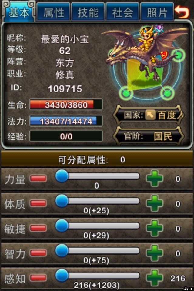 二、技能: 被动 神学12+10 五气12+10 道法自然22 道法天然22 神器专精22 灵兽生存21 灵兽守护20 进階灵守21 驯兽战斗20 洞察魔法22 神秘学2 魔宠契约7+14 主动: 还魂16 元灵22 定身咒1 龙吼0+1 三味22 法冲12+10 女妖8+14 自动: 冰心1 法无1 红月20