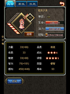 小编不久前从交易所低价收了一只传说宠物——红炎少女。并且手上已经准备了三样东西,宠物洗髓石、宠物重生石、宠物经验卷(3W)。好了,首先我们对于宠物要开始进行洗宠。用宠物洗髓石令宠物重生,直到出现满星为止,至于是成长星级高还是领悟的星级高,看个人需求了。通常成长星级越高,宠物每升一级,属性增长越多;而领悟性越高,每升一级,领悟高等级技能越容易。因为不久前出了潜能石这个道具,小编建议还是选择了领悟高星。