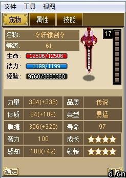 此剑主修穿刺,领悟万剑穿心和强化装备,还没洗好潜能只有个6级战斗技巧。可以看出,18成长魔剑领悟9级战斗技巧的话,穿刺攻击大概有19000,还有4500破甲。这是目前所有宠物里面攻击最高的。此宠有自动神技万剑穿心,能打六人长方并且减240减免和270格挡衰弱状态,持续三回合,绝对是组团刷副的神器,既有惊人的输出,又有惊人的辅助效果。带个这宠刷副本可以让你的队伍效率大幅度提高。关于很多人说它跟熊猫的关系,经楼主N次群架经验告诉你们,这剑在被对方满级虚弱的情况下可以秒对面两万防的传说守护1W+血(算上帮主人挡的),打那种一排红月爆贤诅法控法的队伍,要是带三个这种魔剑,再加俩破甲弓,在被对方虚弱情况下一轮先攻能把对面一排5W血守护秒成灰。当然这里我只是说一下魔剑的输出效果,没其他意思,勿喷。顺便提一下楼主带这宠刷副本时它万剑爆堕狼2W8血(不过被反死了- -!),打团小组老雷和国师都超1W血,打国王大树都是两万多。作为一个宠物这输出实在很惊人了。总结一下就是魔剑在大型副本中可以起到很强大的辅助作用,完全超越怒吼减防萌猫,同时在几乎任何副本里面都有着不错的输出,非常适合固定队伍配一个。单人玩奶带魔剑也是很好的宠物,但是如果涉及到高难小组是绝对比不上弓灵的。
