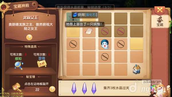 《驯龙物语》设置了不少休闲活动,其中令小编印象深刻的是宝藏神殿玩法。首先,玩家可以通过参与皇宫营救和其他限时活动,获得专属的秘宝锤后,就可以参加宝藏神殿活动啦。在宝藏神殿玩法中,玩家需要用秘宝锤打开板砖,每打开一个板砖消耗一个秘宝锤(每次打开板砖可能会获得物品、水晶或者触发神秘事件)。