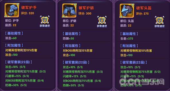 - 套装属性效果:首先攻击力+10%,不说自身的攻击力,单单是套装的属性就可以附加50点攻击力,像大大自身有1W点攻击力,那就是1000点的附加,1000点!1000点!重要的事情说三遍。对BOSS和精英的75%伤害加成,再加上单件的加成,总体超过1倍了!相当于刀刀暴击,如果在出现真正的暴击,那就是4倍伤害!狂拽酷炫吊炸天有木有~而且不光有攻击能力,防御能力也不弱,30%防御加成和15%的闪避加成,配合防御神牛,攻防一体,PK刷图两不误。