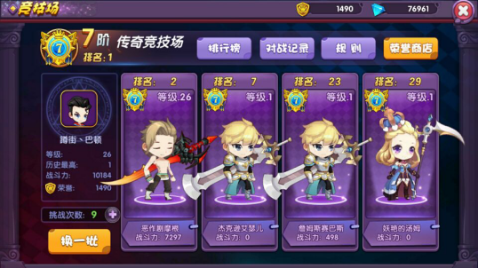 按照玩家名次的不同,竞技场的品阶分为1到7共7种品阶,最低为1阶,最高为7阶。每天有5次挑战机会,没用完的可以累积到第二天,用完当天的次数也可以花钻石购买。