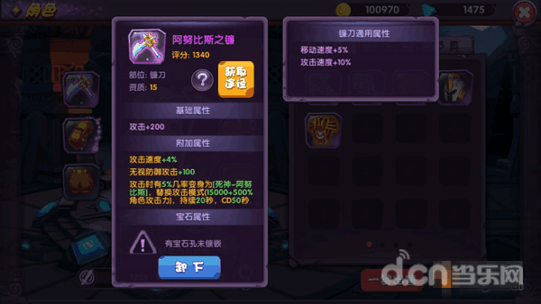 细心的童鞋们会发现,每个武器都有技能,而且武器的名字跟它的技能有关。例如上面的阿努比斯之镰,就是角色能变身为死神阿努比斯,它是没有技能的,但是攻击力很高。宝石属性是需要在武器上镶嵌宝石的,不同的宝石会给武器带来不同的效果,这个后面再说。通用属性就是跟移动速度、攻击速度、技能冷却时间等有关了。这些大家慢慢去探索吧。