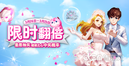 订婚系统上线之后,立刻就成为了游戏中最受玩家追捧的玩法之一,结婚戒指更是一度成为了最热门的游戏道具,每个人都以在游戏中和情侣秀出结婚戒指为乐趣。现在告诉大家一个好消息,在白色情人节活动期间(3月14日-3月15日),点券星愿抽中璀璨之心的概率翻倍!这么千载难逢的机会可不能错过,赶快和你的情侣一起抽取璀璨之心秀出来吧!