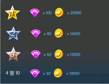 第三个阶段是赛事结束后系统给的奖励:第一名:100钻 20000金币