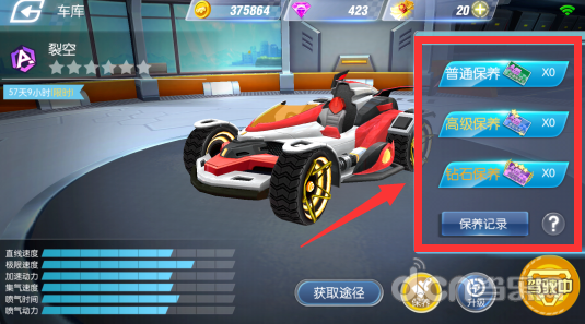 调到想保养的飞车界面,点击保养,有三种卡片可以选择,分别是:“普通保养卡”、“高级保养卡”、“钻石保养卡”。注意:体验版的车是无法保养的!(如图二)