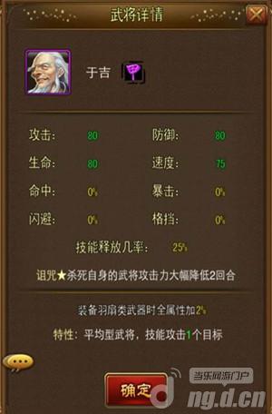 之前公布的天赋为“锁定对方一个武将,双方均无法攻击两回合”和“杀死于吉的武将受到诅咒,攻击力大幅下降”,不过目前的实际天赋一为“杀死自身的武将攻击力大幅降低2回合”,而且当于吉释放技能的时候可以触发封印,使敌方武将无法攻击。关于于吉天赋的具体效果还有待进一步考证,也欢迎大家的交流讨论。
