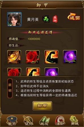 《妖姬Online》中武将众多,玩家难免在中后期获得新的甲级强力武将。将魂一直是稀缺资源。而玩家在培养武将时候往往回错过注重的属性,或是培养一个乙级武将过渡,在后期抽到了好甲级武将却苦于资源问题,升级缓慢,导致游戏进度滞后。一切的这些在之后卸甲系统上线后全是浮云!