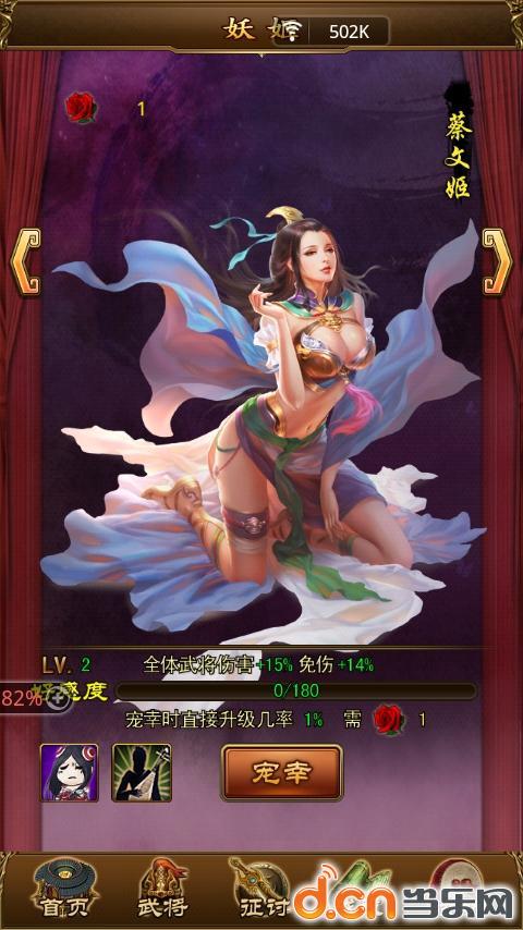 养成系统丰富,既有武将的养成、妖姬的养成,又在武将的养成中穿插了装备的强化要素。大部分武器的强化都可以利用战斗中获得的金钱进行,但是会有10级落差的封顶限制。