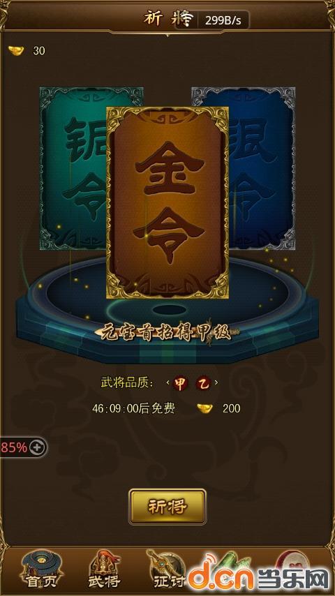 “祈将”选项中,玩家可以以抽奖的方式获得武将,武将的等级按品质分为甲乙丙三种,金银铜三种抽将模式CD由长到短(金为一小时,铜为五分钟),需要花费元宝的方式也对玩家产生了一定的刺激。