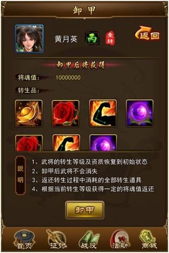卸甲是手机游戏中难得一见的良心设置,武将培养错了还原也好,换新武将使用也好,都十分方便,比武攒攒元宝就能轻松使用,真乃居家旅行杀人必备功能。卸甲后的武将会返还全部转生使用的材料和80%的将魂,方便了玩家对任何阵容和武将的研究实验,节约了大量资源,不必再苦刷材料。