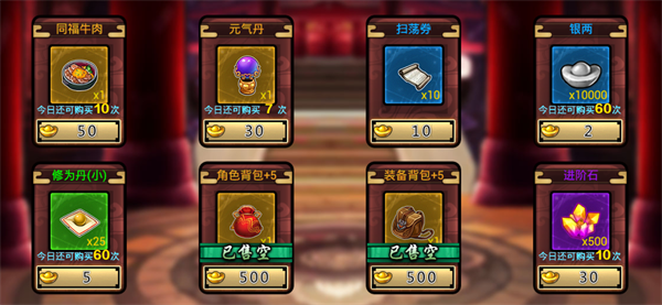元宝商店:售卖的是同福牛肉(体力药),元气丹,扫荡卷,银两,修为丹,进阶石等物品,价格也还算公道,推荐指数五颗星!