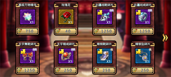 功勋商店:主要售卖稀有装备碎片,宝物强化精华和玫瑰花,功勋牌子需要通过千层宝塔才能获得,为了装备,刷吧!