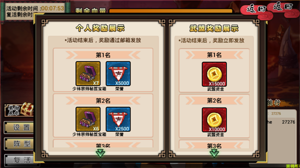 武盟奖励: 对BOSS造成伤害排名前5的武盟将获得资金奖励;