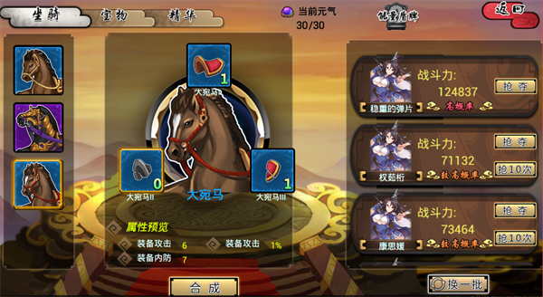 马匹和宝物两种装备可通过抢夺宝物碎片后拼图获得,点击征战-宝物抢夺可看见如下图画面