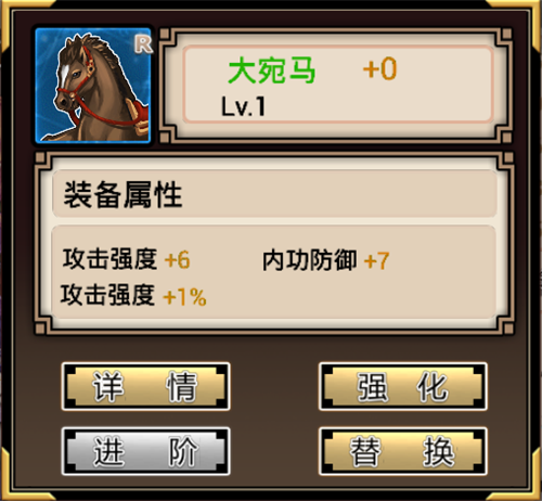 马匹会给武娘带来攻击强度,内功防御,和百分比提高攻击强度的装备效果