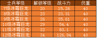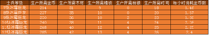 冰霜巨龙生产所需资源、时间及每小时消耗金币数: