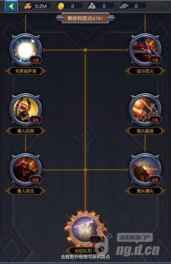 目前游戏内兽族总共有三个出征队列的科技,其中两个在军事科技树中,一个在战略科技树中,军事类的出征队列一个在第一层,一个在第六层,战略类的出征队列在第四层,最快速的研究出三个出征队列的方式如下: