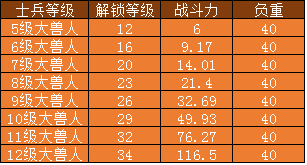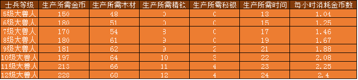 大兽人生产所需资源、时间及每小时消耗金币数: